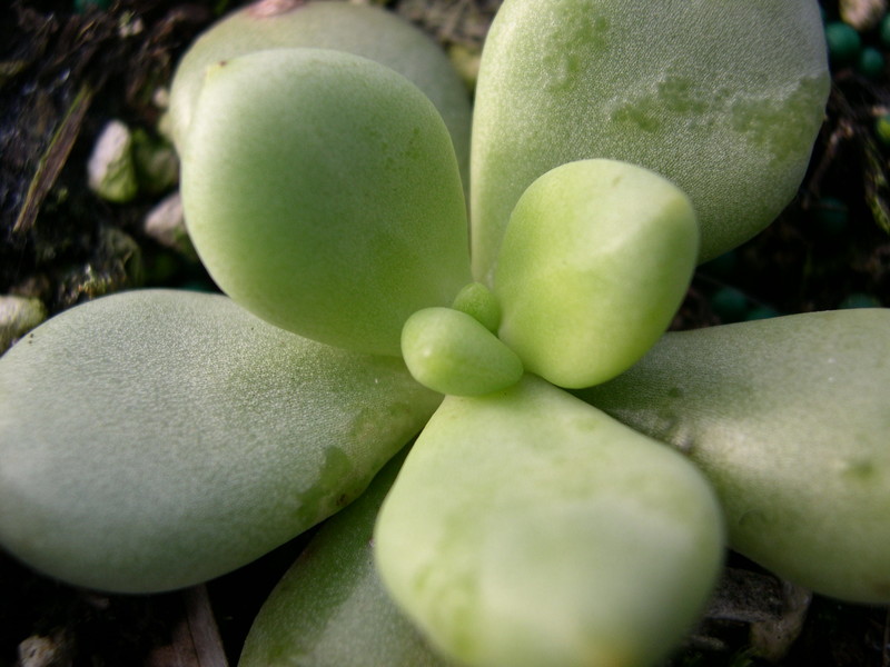 This variety appears to be a link between Sedum and Echeveria. Extremely large succulent leaves are dusty,dull green. Drooping stems of star-shaped light yellow blossoms. Is rather promiscuous and tends to easily cross with various Mexican genera. From Mexico.